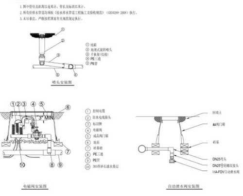 主要建设内容:地埋伸缩喷头安装、输水管线开挖回填和管道安装、、电磁阀安装、智能灌溉控制器安装。